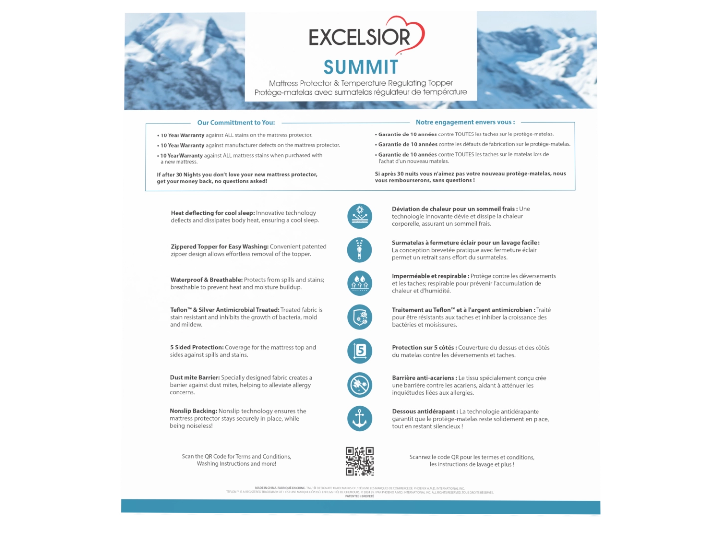 Le protège-matelas Excelsior Summit avec surmatelas intégré régulateur de température disperse la chaleur corporelle pour un sommeil plus frais et équilibré. Doté d’une fermeture éclair brevetée, d’un traitement Teflon™ anti-taches et d’une protection antimicrobienne à l’Argent, il offre une protection imperméable complète. Garantie 10 ans et essai 30 nuits chez Matelas Expert Québec.